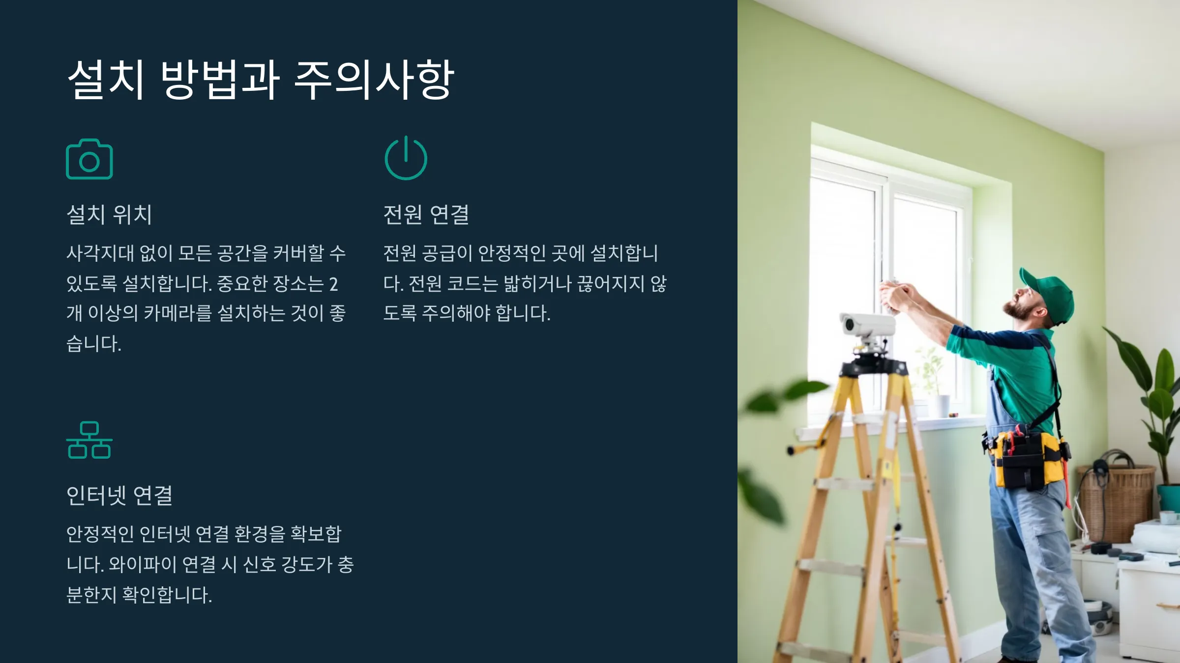 CCTV를 설치할 때는 보안과 영상 품질을 극대화하기 위해 몇 가지 주의사항을 염두에 두어야 해요. 다음은 설치 시 꼭 확인해야 할 사항들이에요: