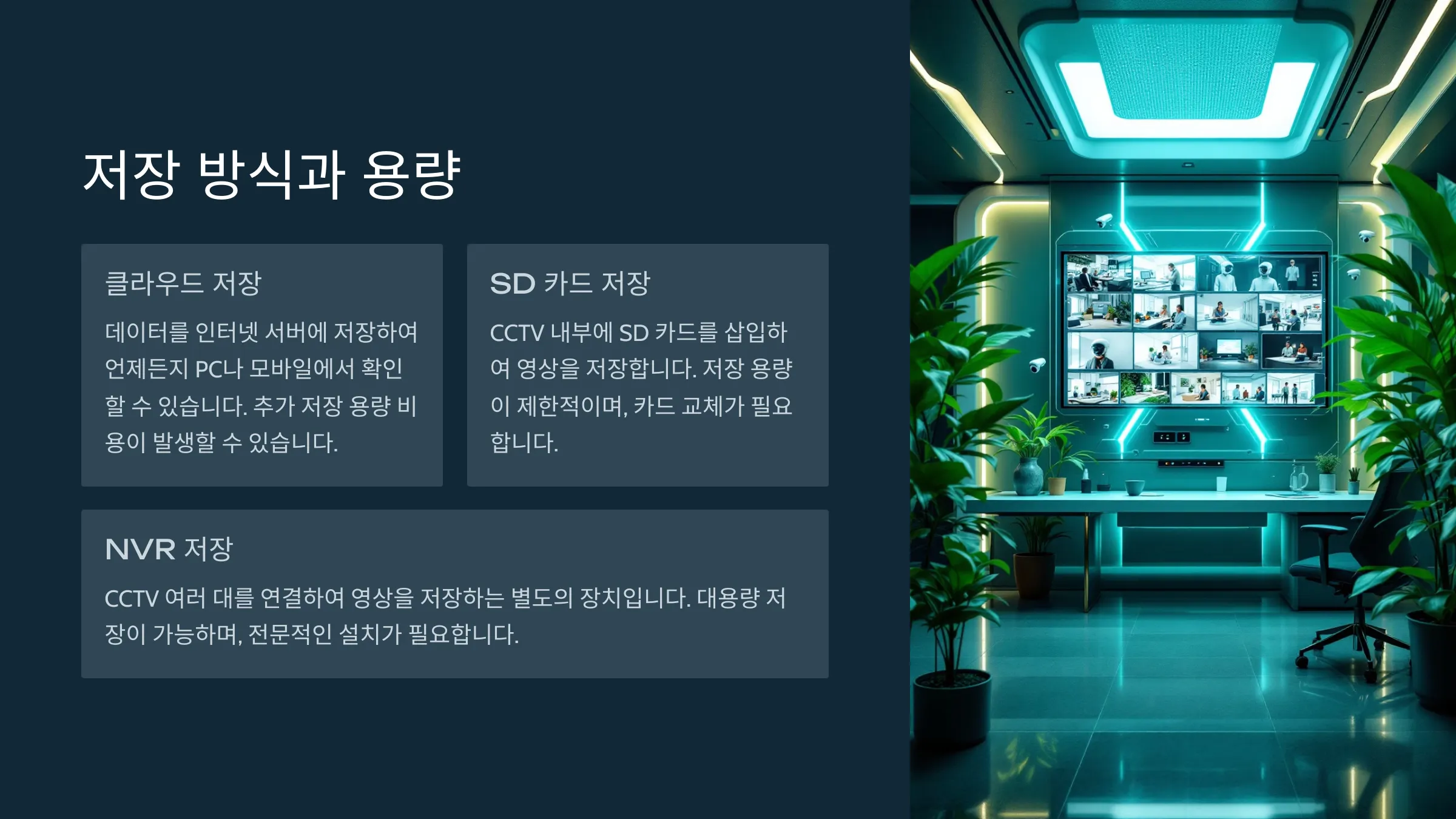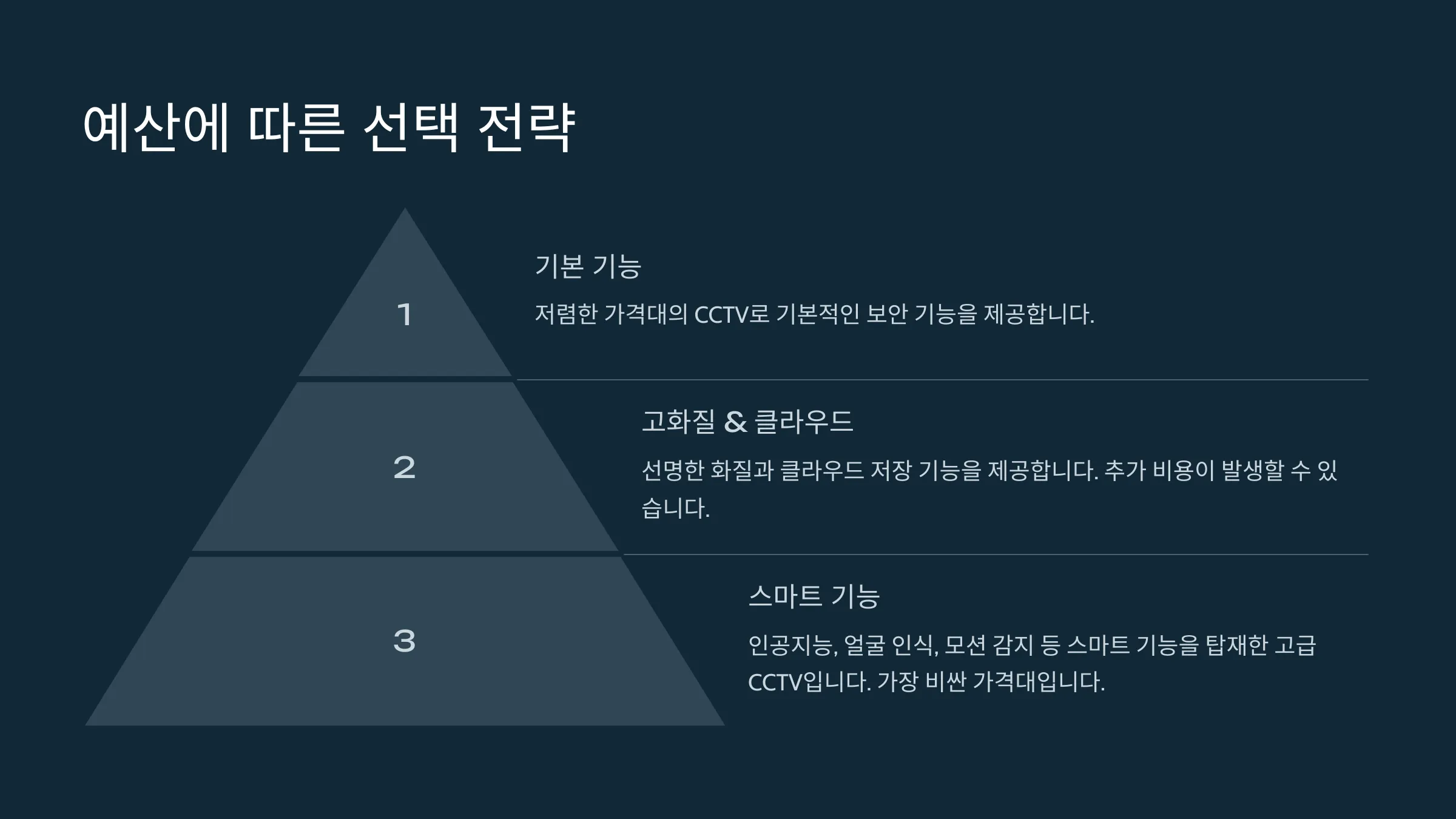 3. 고급형 모델: 고화질 영상, 클라우드 저장, 인공지능 분석 기능까지 제공돼요. 넓은 지역이나 고급 보안이 필요한 경우 적합해요.