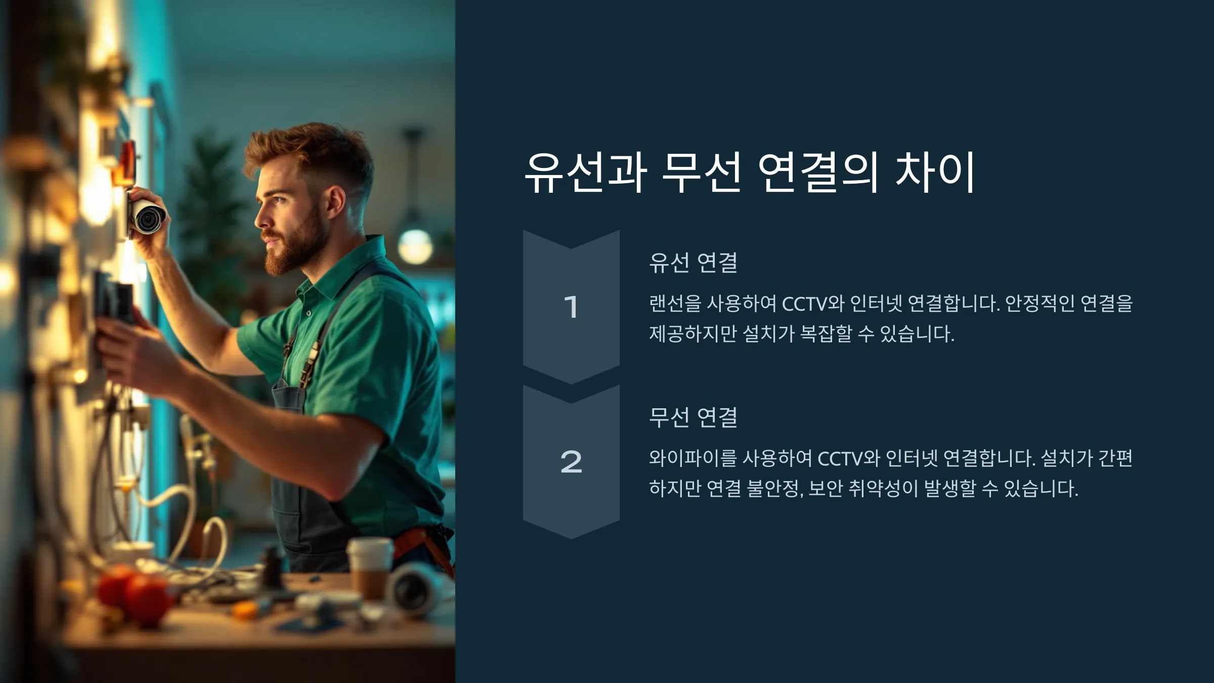 CCTV를 선택할 때, 연결 방식은 설치와 사용의 편의성에 큰 영향을 미쳐요. 가정용 CCTV는 주로 유선과 무선 방식으로 구분되는데, 각각의 장단점은 다음과 같아요: