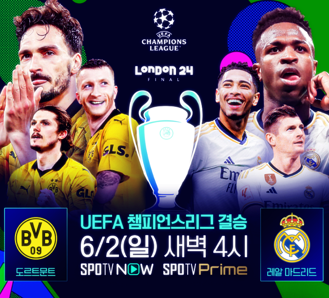 2024년 챔피언스리그 결승, 레알 마드리드 대 도르트문트의 경기는 'SPOTV NOW'와 'SPOTV PRIME'에서 TV와 OTT 스트리밍으로 실시간으로 볼 수 있습니다.