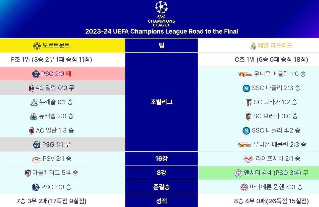 챔피언스리그 결승 진출까지 레알마드리드는 베를린, 나폴리, 브라가, 라이프치히, 맨시티, 그리고 뮌헨을 차례로 이기며 올라왔습니다. 이번 시즌을 무패로 마친다면 레알마드리드 최초의 챔피언스리그 무패 우승이라는 대기록을 세우게 됩니다.