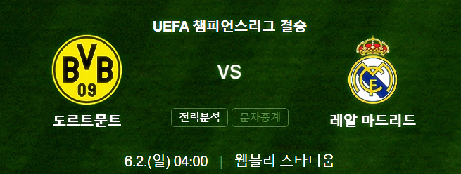 결승에서 맞붙는 팀은 세계 최정상 클럽인 스페인의 레알마드리와 독일 분데스리가 명문 도르트문트입니다. 전문가들은 레알마드리의 승을 점치고 있지만 공은 둥글기 때문에 어떤 결과가 나올지 예측이 불가능합니다.