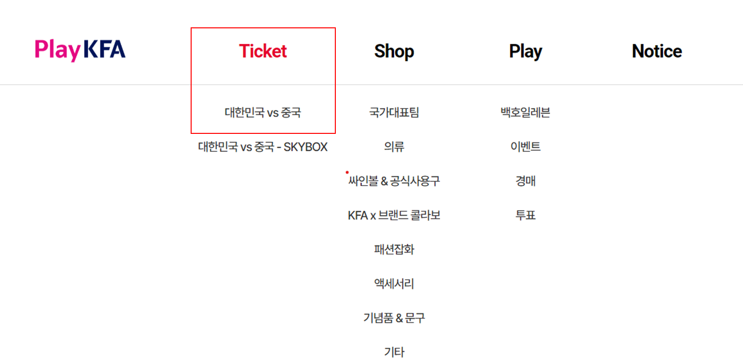 - [상단의 티켓 메뉴 → 대한민국 vs 중국 클릭]