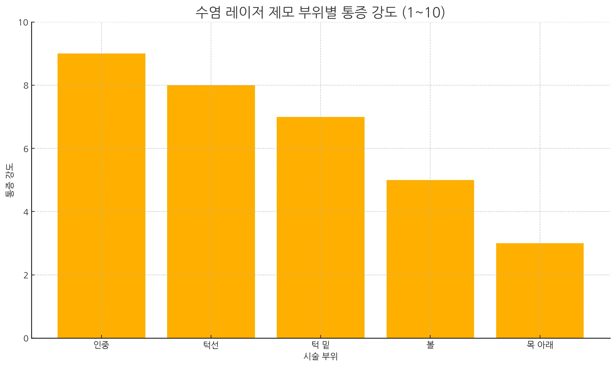 시술자들이 가장 민감하게 느끼는 부위는 인중과 턱선입니다. 아래 그래프는 부위별 평균 체감 통증을 10점 만점 기준으로 시각화한 자료입니다.