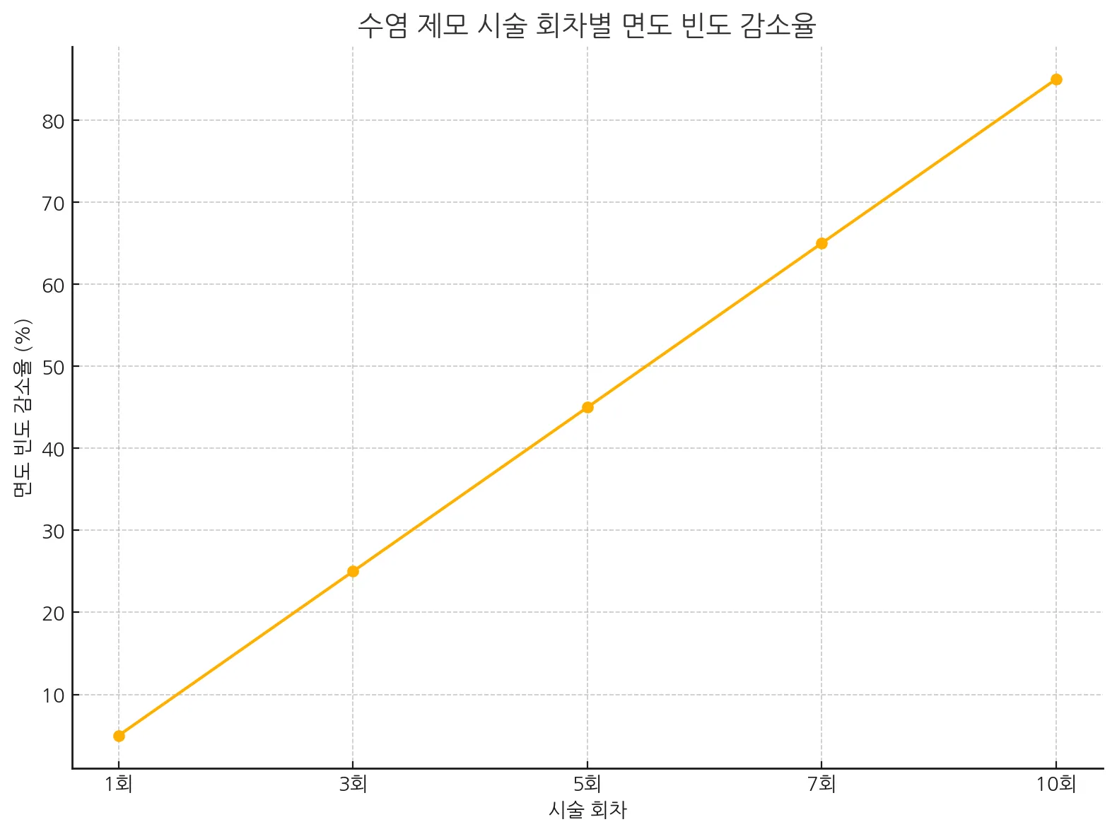 그래프 설명: 위 그래프는 수염 제모 시술 회차에 따른 면도 빈도 감소율을 나타낸 것입니다. 회차가 누적될수록 면도 횟수가 현저히 줄어드는 경향을 보이며, 평균적으로 7회 이상 시술 시 일상에서 면도가 거의 필요 없을 만큼의 지속력을 경험할 수 있습니다.