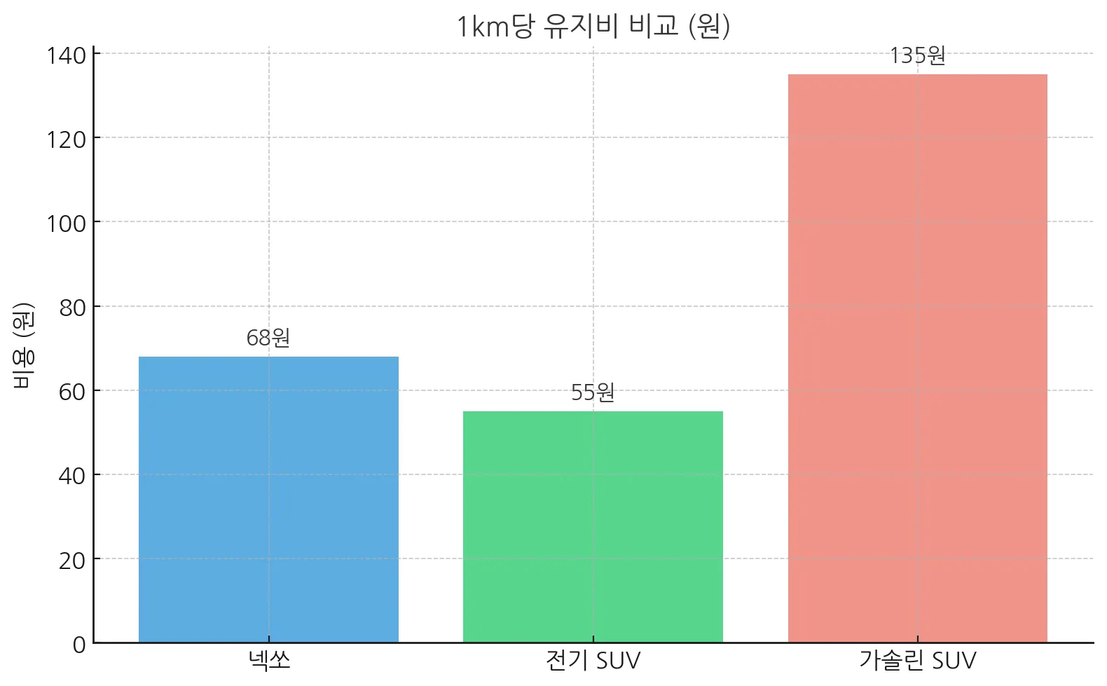 | 1km당 비용 | 약 68원 | 약 50~60원 | 약 120~150원 |
