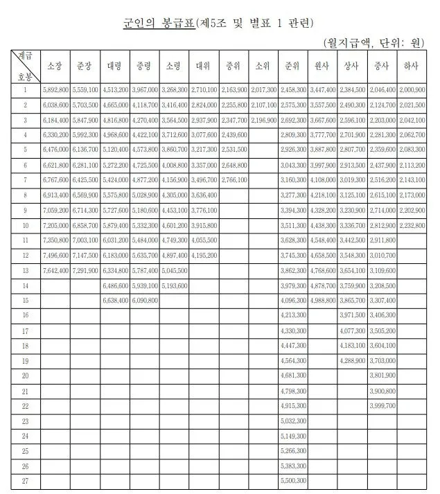 군인 월급 인상과 계급별 봉급표