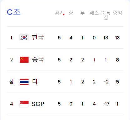 우리나라는 중국, 싱가포르, 태국과 함께 C조에 속해 있습니다. 6월 6일(목) 싱가포르와의 5차전에서 승리하여 조 1위로 최종 예선 진출을 확정지었습니다. 조 2위는 태국과 중국이 치열하게 경쟁 중인데, 6월 6일(목) 양 팀의 경기가 1:1 무승부로 끝나면서 마지막 6차전에서 조별 순위가 결정될 전망입니다.